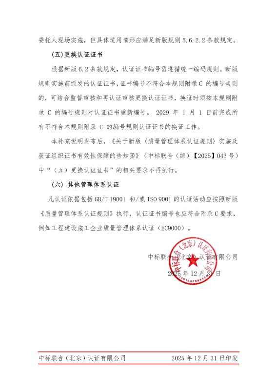 關于新版《質量管理體系認證規則》實施及獲證組織證書有效性保障的告知函的補充說明