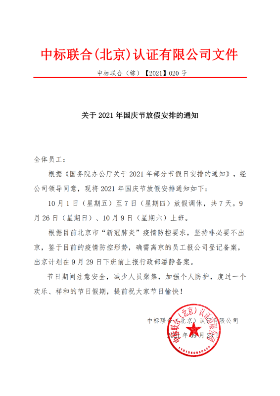 關(guān)于 2021 年國慶節(jié)放假安排的通知