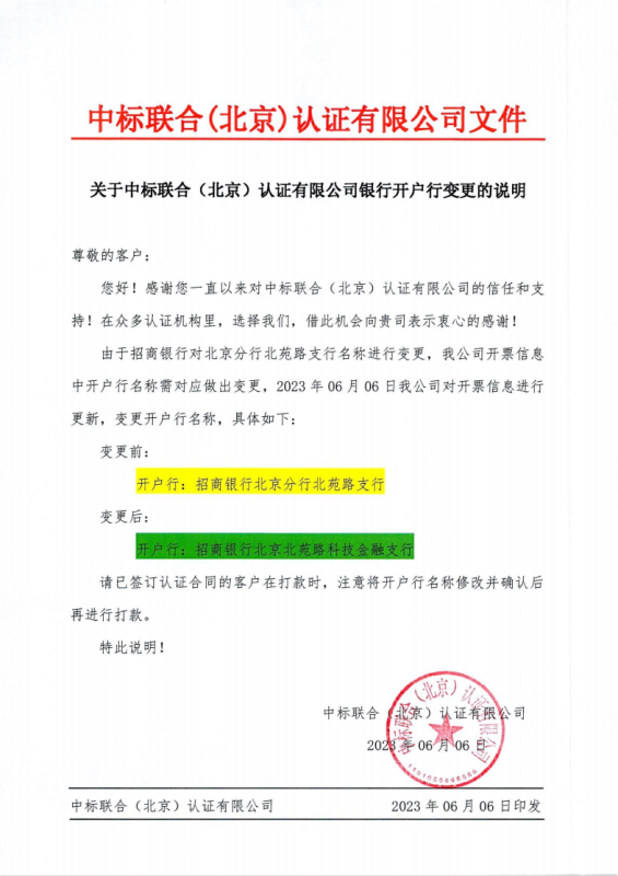 關于中標聯合(北京)認證有限公司銀行開戶行變更的說明