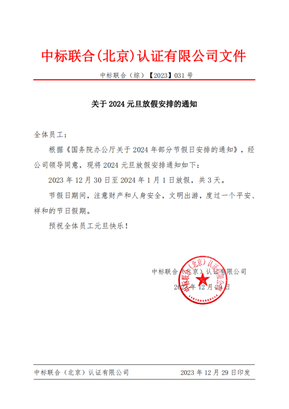 關于2024年元旦放假安排的通知