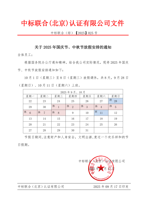 關于 2025 年國慶節、中秋節放假安排的通知